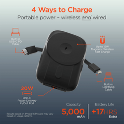 Magnetic wireless fast charging for your phone. A USB-C Power Delivery port with up to 20W output. And dual built-in USB-C PD and Lightning cables. Charge all your gear on the go, and leave the mess of extra cables at home. Designed with an ergonomically slim profile and rounded body that make it comfortable to hold while you talk or scroll.