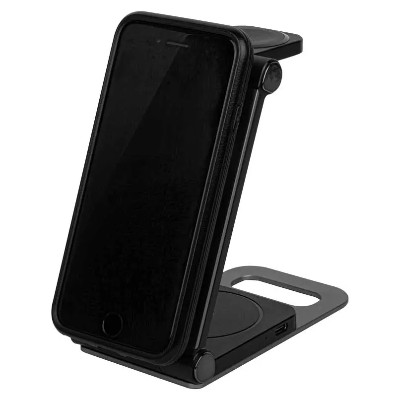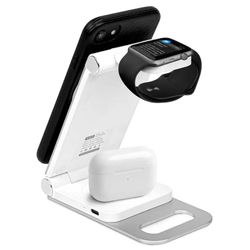 Power up your phone, iWatch, and earphones at once with this sleek, foldable charging station. MagSafe compatibility and lightning-fast charging make it the perfect desk companion. Wireless Fast Charging, Mag-Safe Connection, and an LED indicator. Includes one Travel 3 in 1 Wireless Foldable Charger and a Type-C USB charging cable. Input: 9V/12V 3A (MAX). Output 1: Phone 1 5W (MAX). Output 2: iWatch 2.5W (MAX). Output 3: Earphones 3.5W (MAX). Compatibility: support mobile phones, earbuds, and Smart Watches